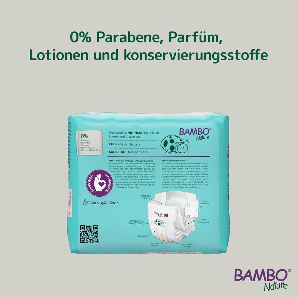 Die Bambo Nature Windeln sind weich, komfortabel und besonders geeignet für empfindliche Haut. Sie bestehen aus einem Saugkern mit Superabsorber und der neuesten Technologie an Flüssigkeitskanälen. Auf diese Weise kann Urin schnell aufgenommen werden und die Bambo Nature Windel sorgt für eine trockene Babyhaut– auch während der Nacht. Dies minimiert das Risiko für Windelausschlag und Hautirritationen.
