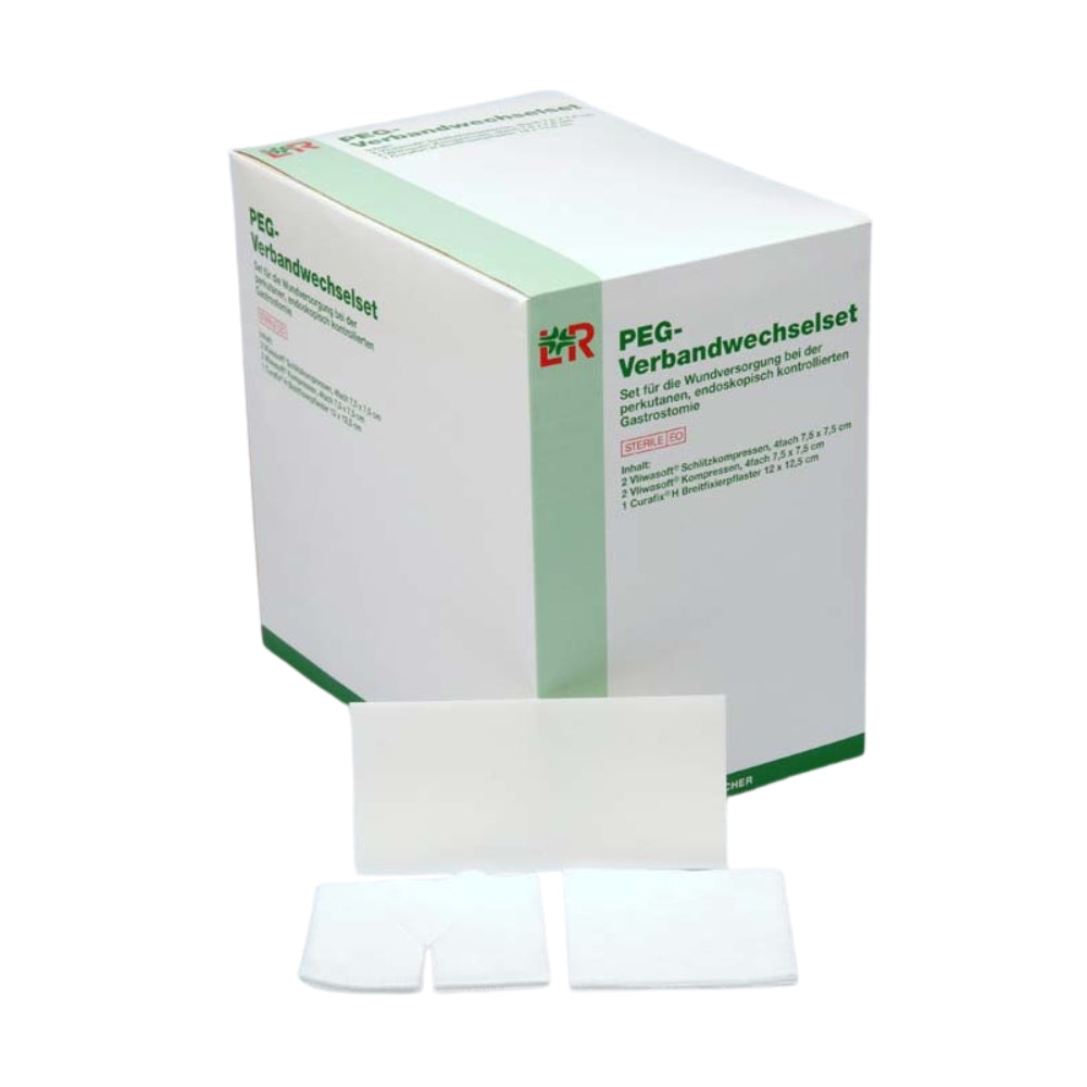 Bei dem PEG-Verbandwechselset handelt es sich um ein mehrteiliges steriles Set, das aus 2 Vliwasoft Schlitzkompressen, 2 Vliwasoft Kompressen sowie einem Curafix H Breitfixierpflaster besteht.